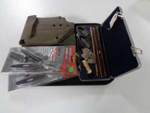 A tray of cased gun cleaning kit, two Berkley fishing tools (new), together with a military shovel in carry pouch