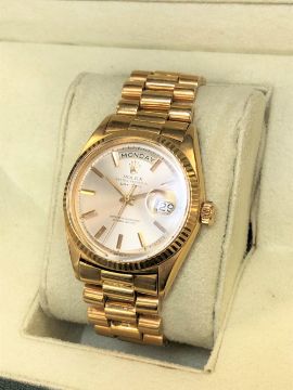 Rolex - A gentleman's 18 carat gold Oyster Perpetual Day-Date automatic wristwatch, model 1803, circa 1970's, gilt dial with baton markers, day aperture at 12 o'clock, date aperture at 3 o'clock, fluted bezel, screw-down crown, on an 18 carat gold President bracelet with Oyster clasp, with Rolex service guarantee card dated 16/12/03, strung with plastic retail fob, with booklets, with branded green wallet, with box and outer card case, gross weight 111 grams.