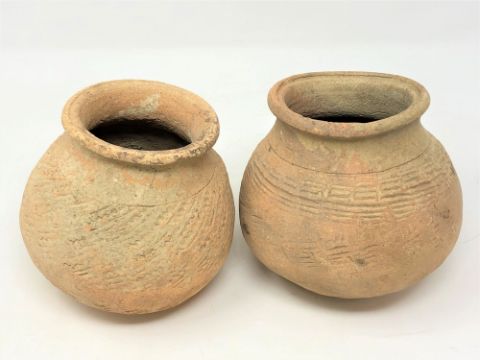 Two ancient terracotta pots, believed to be Thai, height 13 cm. (2)