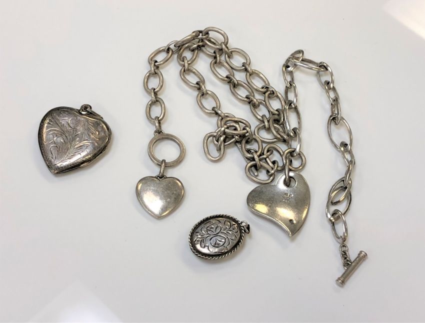 Two silver chains strung with hearts, together with two engraved silver lockets. (4)