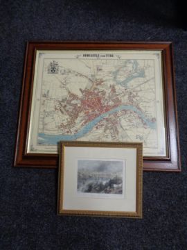 A contemporary framed map - Newcastle upon Tyne in 1858 together with a framed colour engraving - Newcastle from the south west