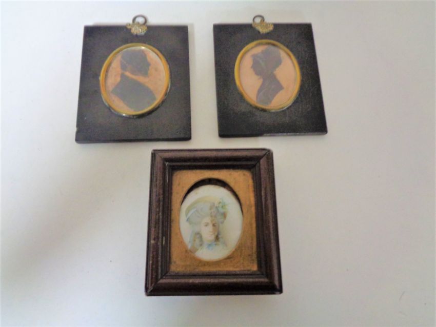 Two George III silhouette type miniatures together with a further portrait miniature behind glass.