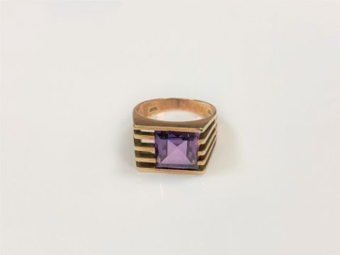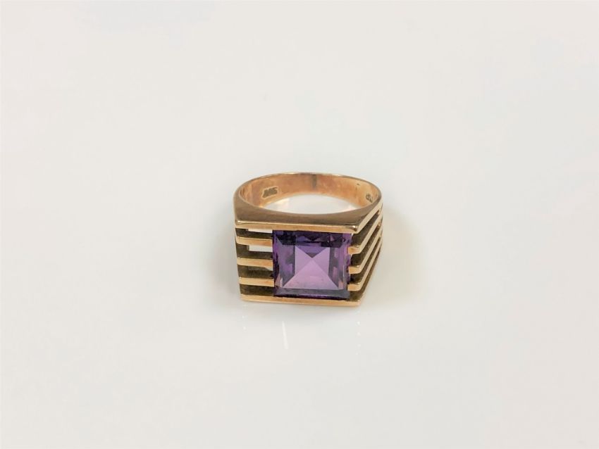 A 14ct gold 70's style ring set with a square cut purple stone, size K/L.