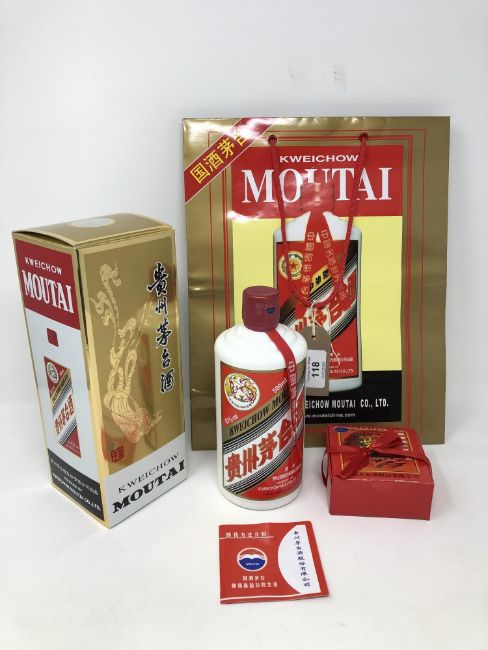 One bottle - Kweichow Moutai (Distilled Chinese Spirit), 53% vol, 500 ml, sealed and boxed, with presentation cups (contained within), and original retail bag.