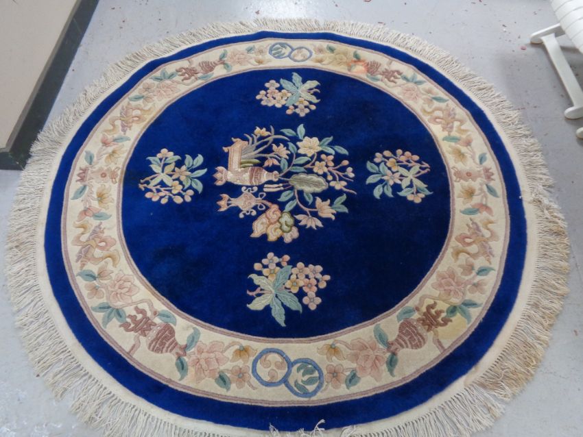 A circular fringed Chinese rug on blue ground