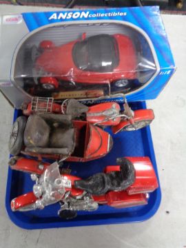 A tray of boxed Amso die cast vehicle - Plymouth, together with tin plated motorcycle with side car, further model bike