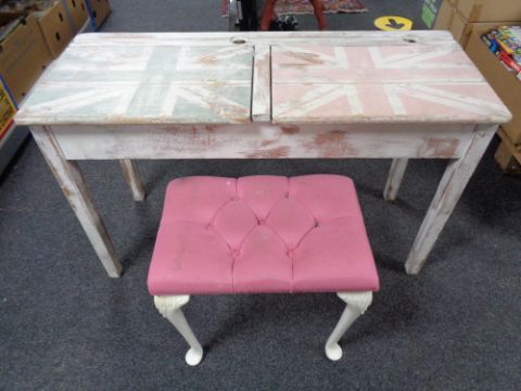 A twentieth century shabby chic double school desk together with a pink stool