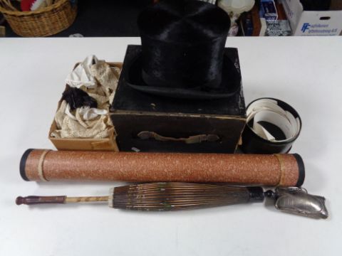 A box of top hat by Bliss's of London, Gent's collars, vintage parasol in tube, plated purse etc