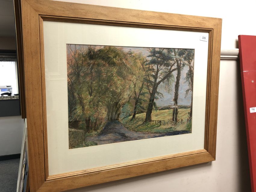 Twentieth century school : Country road with sign post, colour chalks, indistinctly signed, 32 cm x 46 cm, framed.