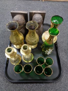 A pair of carved hardwood bookends, Indian brass vases and candlesticks, hand painted vase and seven piece green glass liqueur set