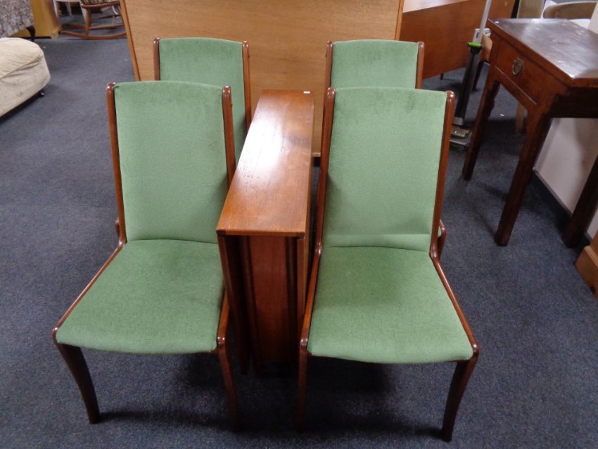 A twentieth century narrow teak drop leaf table together with a set of four teak dining chairs upholstered in green dralon
