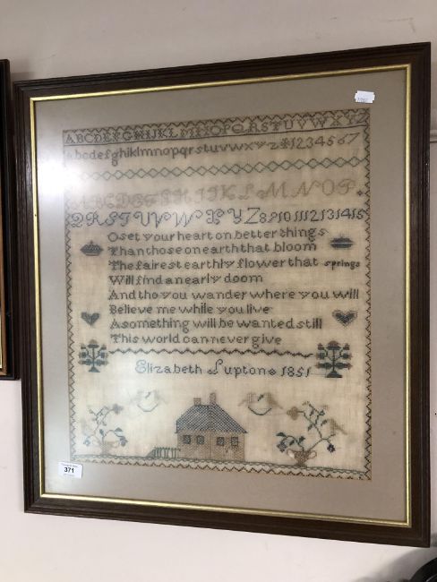 A nineteenth century sampler by Elizabeth Supton dated 1851, framed.