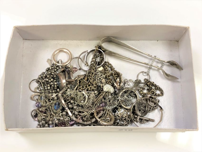 A box of silver and white metal jewellery, necklaces, chains etc (Qty)