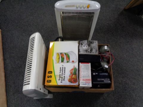 Two electric heaters together with a box of Panasonic digital camera, Swan steam iron, lamps, camera observation system