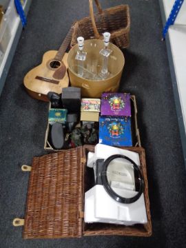 An acoustic guitar, wicker baskets, pie maker, hat box and glass etc