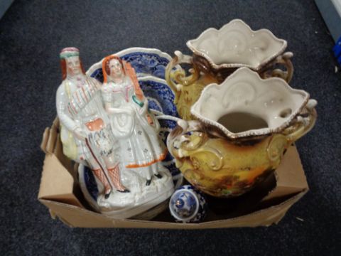 A box of antique printed vases, Staffordshire figure, Masons blue and white dinner ware