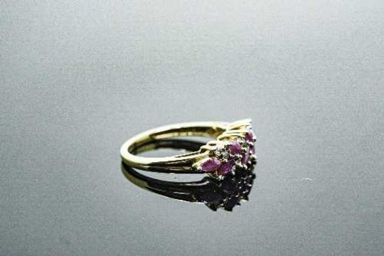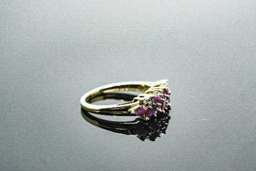 A 10ct gold ruby and diamond ring, approximately 0.9ct rubies, size N.