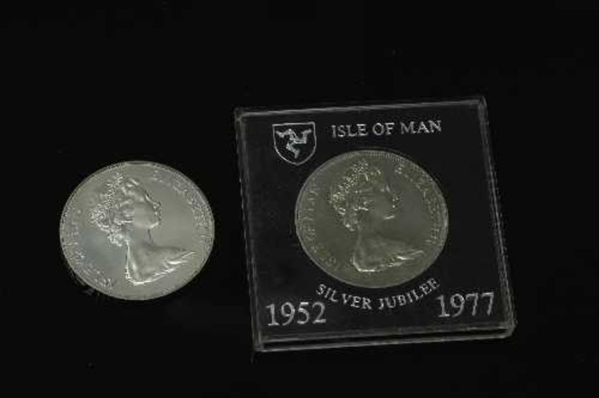 The Pobjoy Mint - 1977 sterling silver commemorative crown, together with a further Isle of Man Silver jubilee crown. (2)