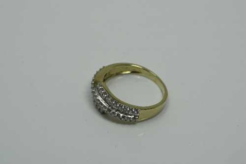 An 18ct yellow gold diamond ring set with baguette and round cut diamonds, size L/M.