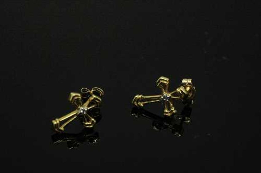 A pair of yellow gold diamond set cross earrings, 12 mm x 9 mm.