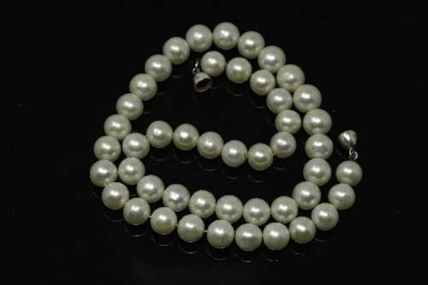 A cultured pearl necklace with sterling silver clasp, length 42 cm.