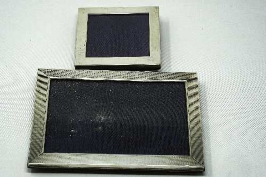 Two silver photograph frames, 8.2 cm x 8.2 cm & 11.4 cm x 15.4 cm. (2)