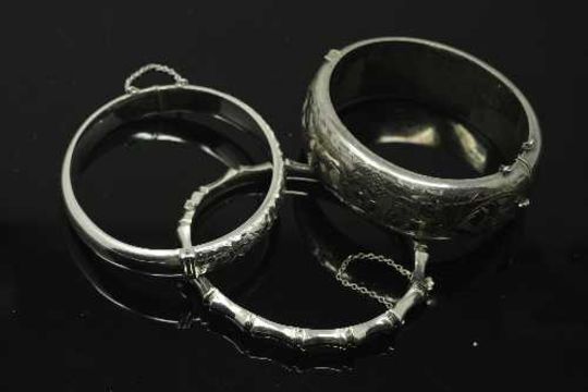 Three silver bangles. (3)