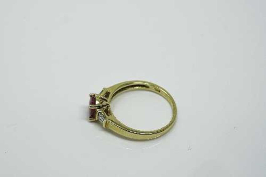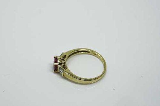 A 10ct gold ruby and diamond ring, the central ruby approximately 1ct, 2.6g, size N.