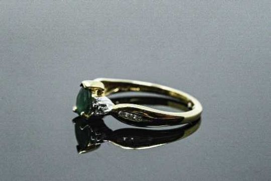 A 10ct yellow gold emerald and diamond ring, approximately 0.25ct emerald, size M.