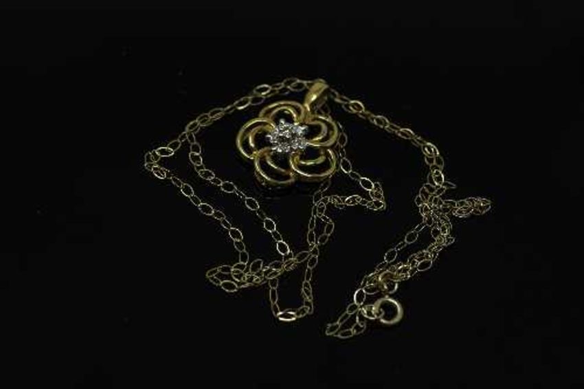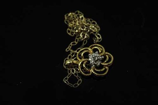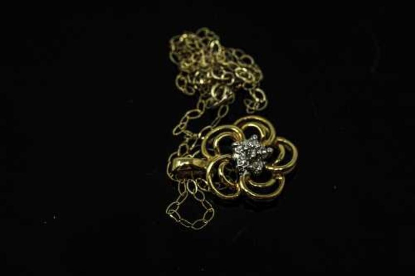 A 10ct yellow gold diamond set pendant on chain, width approximately 14mm.