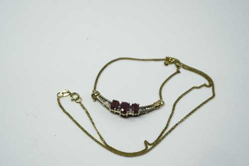 An 18ct yellow gold ruby and diamond pendant on chain, set with fourteen baguette cut diamonds approximately 0.16ct, the central ruby 0.37ct, pendant width 34mm.