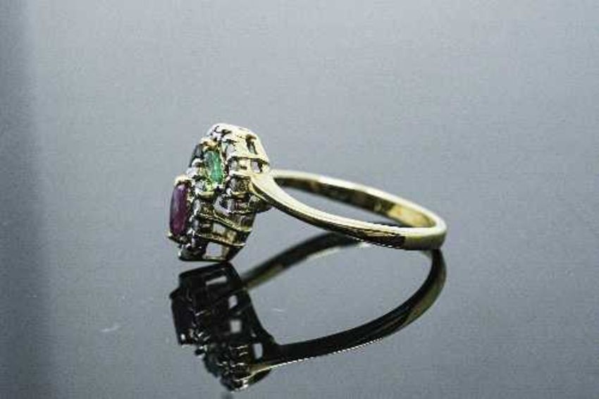 A 10ct gold ruby, sapphire, emerald and diamond ring, size M/N.