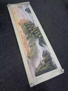 A mid century Japanese watercolour scroll depicting a landscape, boxed.
