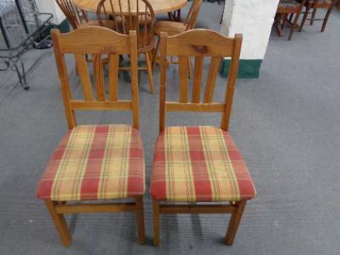 A contemporary oak effect dining table together with a pair of pine dining chairs