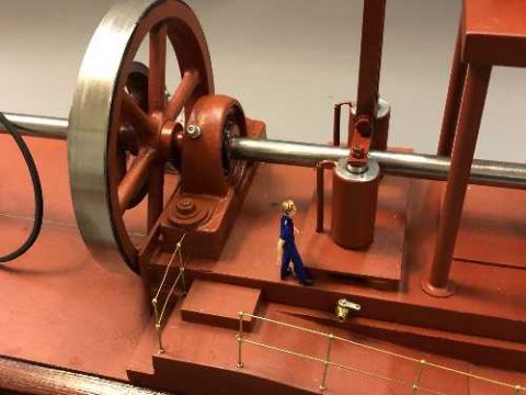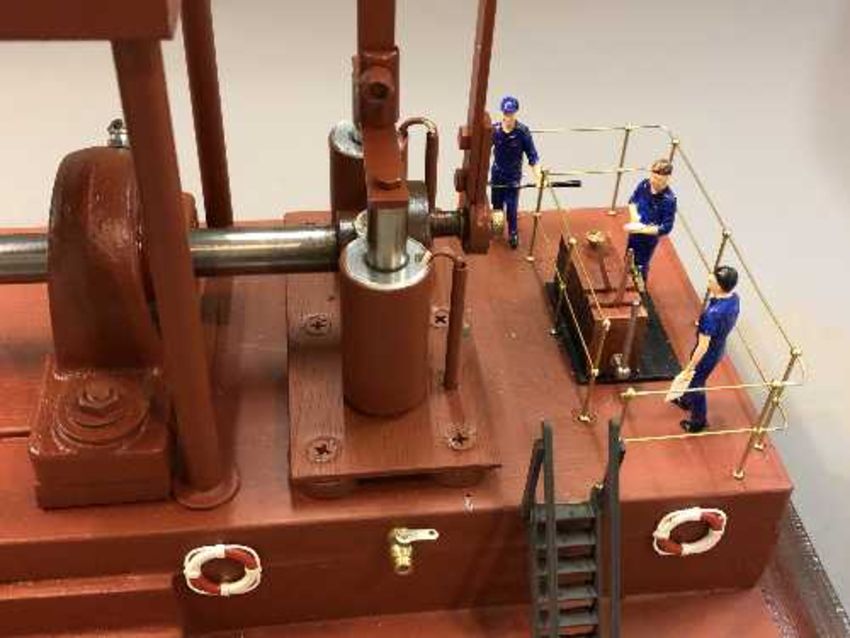 A large model Walking Beam Marine Engine 1904, on plinth under glass cover, 87cm by 42cm by 31cm overall.