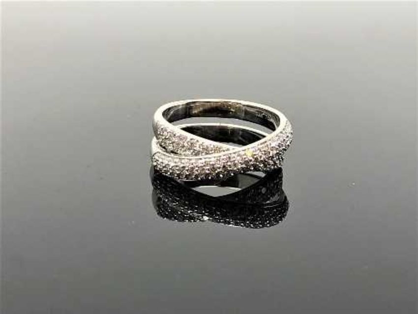 An 18ct white gold diamond cross over ring set with forty two diamonds, size O/P.