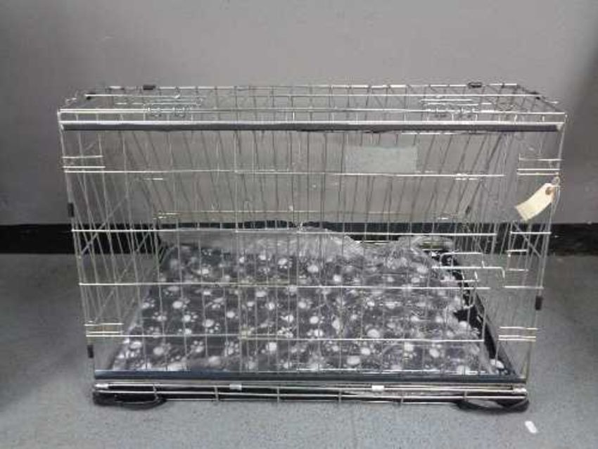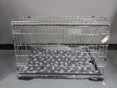 A folding black metal dog cage, height 52 cm, width 82 cm, depth 50 cm.