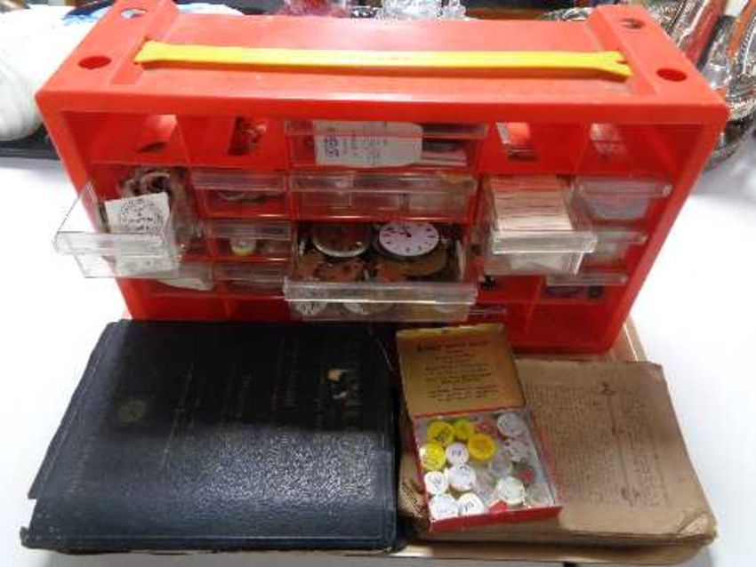 A tray of horologist watch parts and books