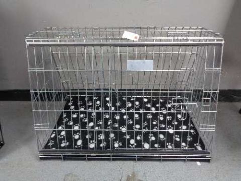 A folding black metal dog cage, height 67 cm, width 86 cm, depth 56 cm.