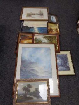 A quantity of assorted framed pictures, oil on board, framed watercolour, rural landscape etc