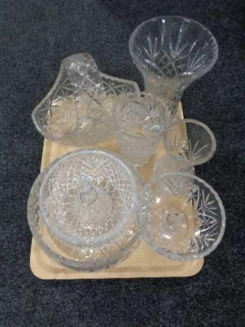 A tray of glass ware, cut glass and crystal fruit bowl, vases, hand bell etc