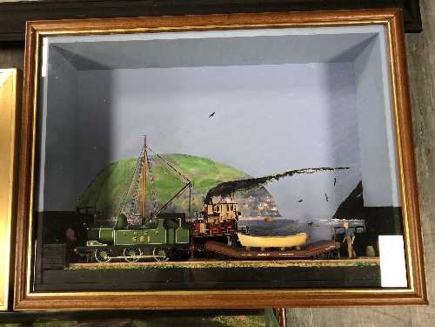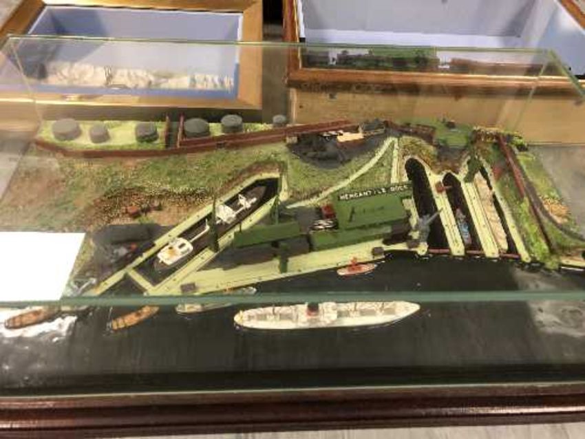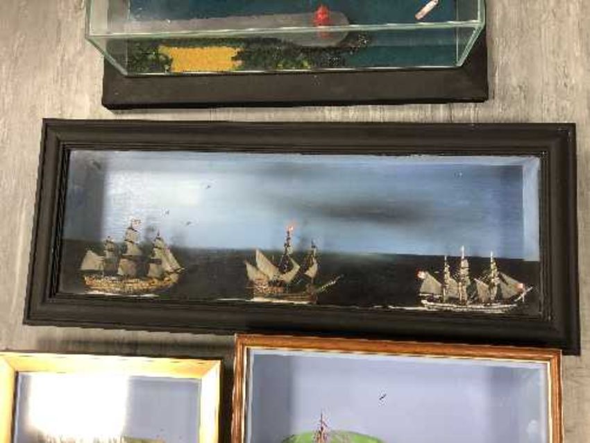 Five dioramas depicting sailboats, mercantile dock etc, largest 68cm wide.