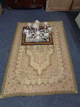 A tapestry rug together with a metal light fitting with glass drops, contemporary wall mirror
