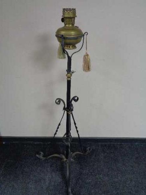 An antique wrought iron rise and fall standard lamp with brass oil lamp