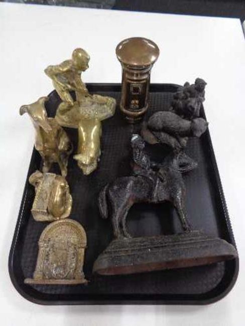 A tray of metal ware, brass miner, cast iron door stop, figure on horse etc