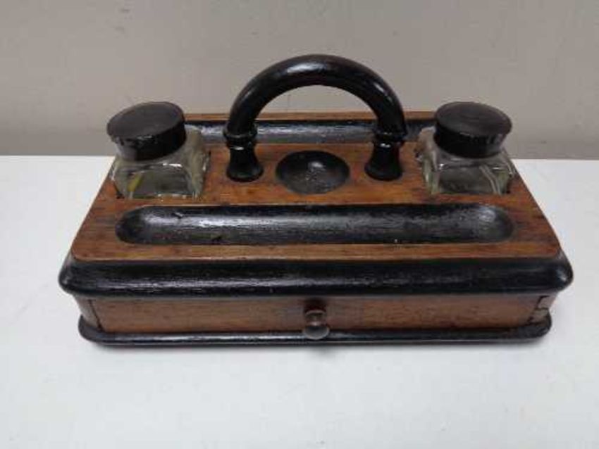 An Edwardian desk stand fitted a drawer and two glass ink wells