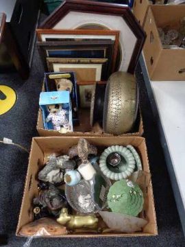 Two boxes of Meerkat soft toys, contemporary figurines, glass ware, prints etc
