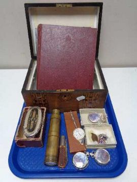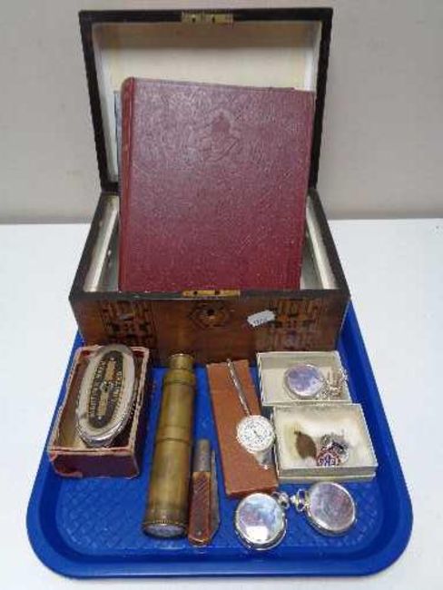 A Victorian inlaid walnut table box together with brass cased pocket telescope, Martins money bank, enamelled badges, pocket watches