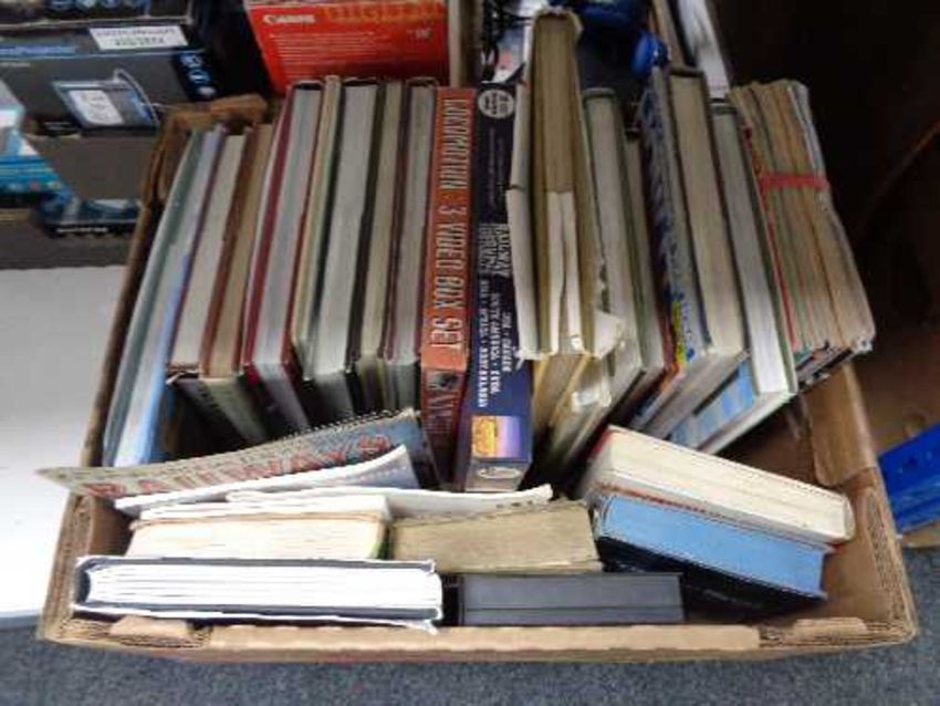 A box of books and magazines relating to trains and railways