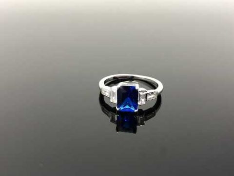 A Sterling silver Art Deco style emerald cut ring set with a blue stone, size N.